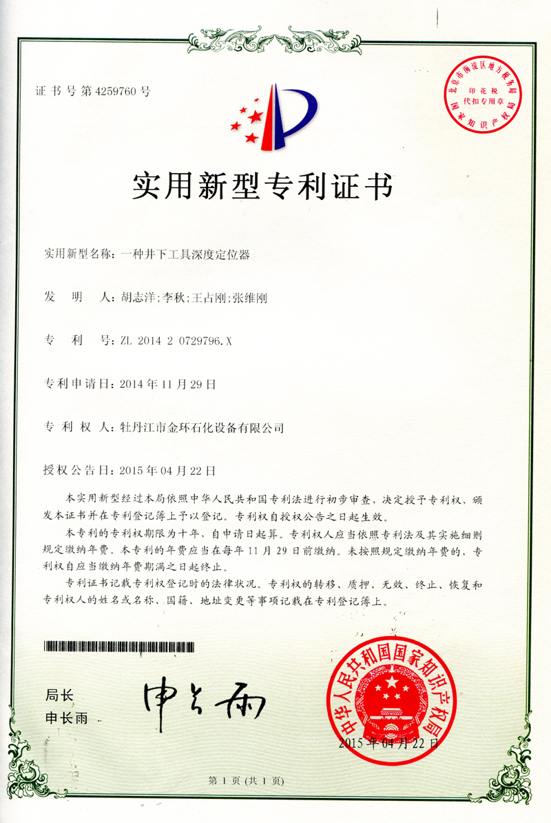 一種井下工具深度定位器實(shí)用新型專利證書(shū)ZL 2014 2 0729796.X